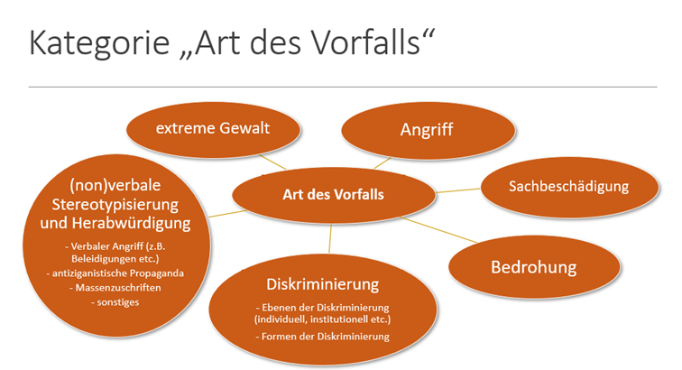 Bei der Unterscheidung der Vorfallarten orientiert sich MIA an Kategorisierungen anderer Monitoring-Strukturen. Die Kategorien erfassen den grundsätzlichen Charakter des Vorfalls und dienen der zentralen Einordnung der Vorfälle. Die Differenzierung der Vorfallkategorien bezieht sich nicht auf gegebenenfalls mit den Vorfällen einhergehenden Straftatbeständen.